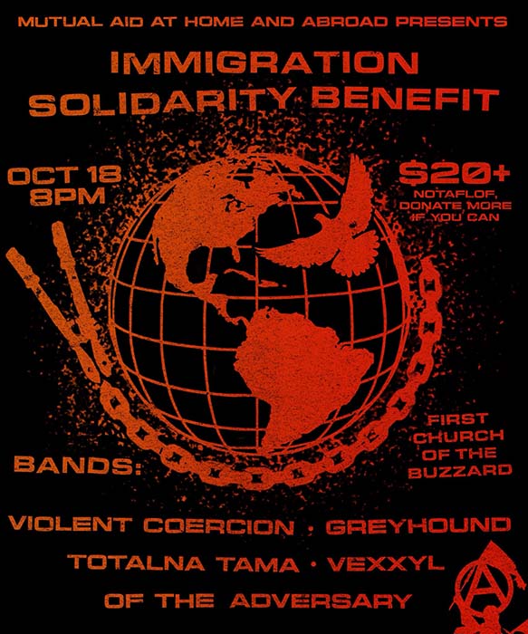Mutual Aid at Home and Abroad presents: Immigration Solidarity Benefit. Violent Coercion, Greyhound, Totalna Tama, Vexxyl, Of The Adversary, plus DJ B-Hopf. Saturday October 18, at First Church of the Buzzard, Oakland. 8pm, $20: donate more if you can.