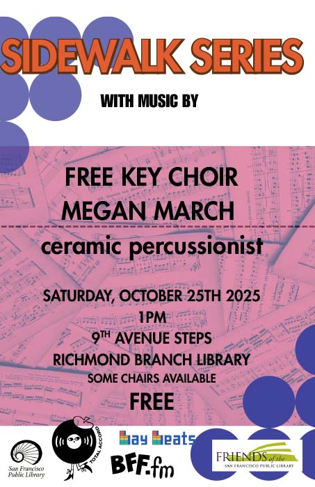 Sidewalk Series with music by Free Key Choir, Megan March (ceramic percussionist). Saturday October 25, at Richmond/Senator Milton Marks Branch Library, 9th Ave Steps, Richmond District, SF. 1pm, FREE, some chairs available.