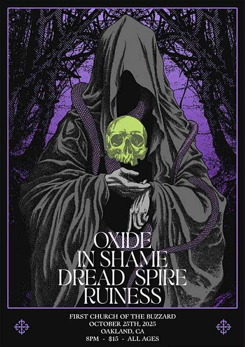 Oxide, In Shame, Dread Spire, Ruiness. Saturday October 25, at First Church of the Buzzard, Oakland. 8pm, $15, all ages.
