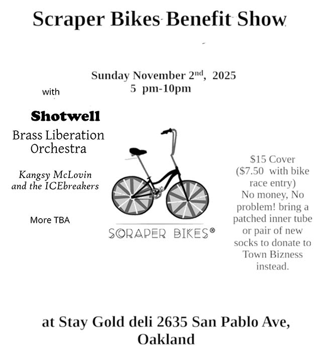 Scraper Bikes Benefit Show: Shotwell, Brass Liberation Orchestra, Kangsy McLovin and the ICEbreakers. Sunday November 2, at Stay Gold Deli, 2635 San Pablo Ave, Oakland. 5pm - 10pm, All Ages. $15 ($7.50 with bike race entry). No money, No problem! bring a patched inner tube or pair of new socks to donate to Town Bizness instead.