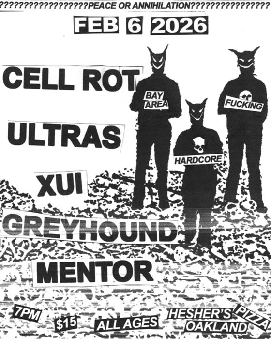 Cell Rot, Ultras, Xui, Greyhound, Mentor. Friday February 6, at Hesher's Pizza, Oakland. 7pm, $15, All ages.