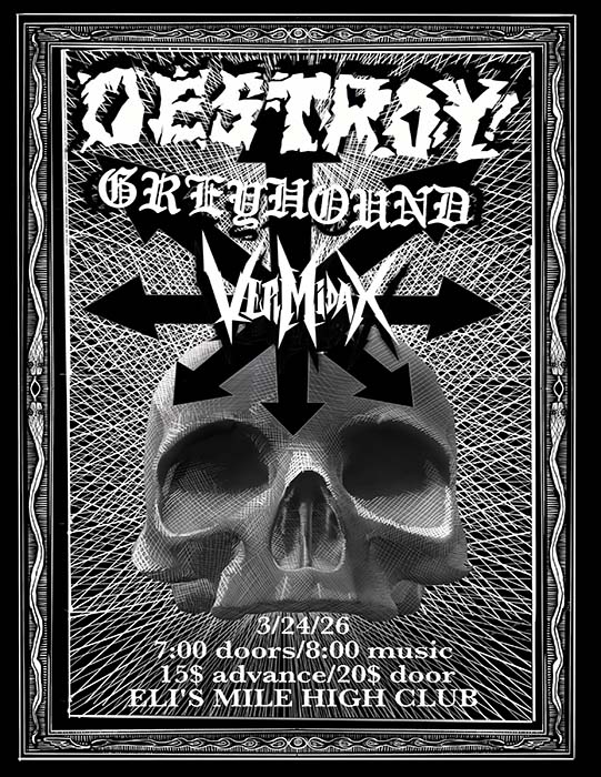 Destroy, Greyhound, Vermidax. Tuesday March 24, at Eli's Mile High Club, Oakland. Doors 7, Music 8. $15 adv, $20 at door.