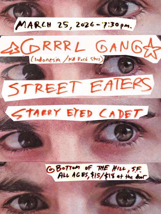 Grrrl Gang (Indonesia, Kill Rock Stars), Street Eaters, Starry Eyed Cadet. Wednesday March 25, at Bottom of the Hill, SF. 7:30pm, $15 adv, $18 door. All Ages.