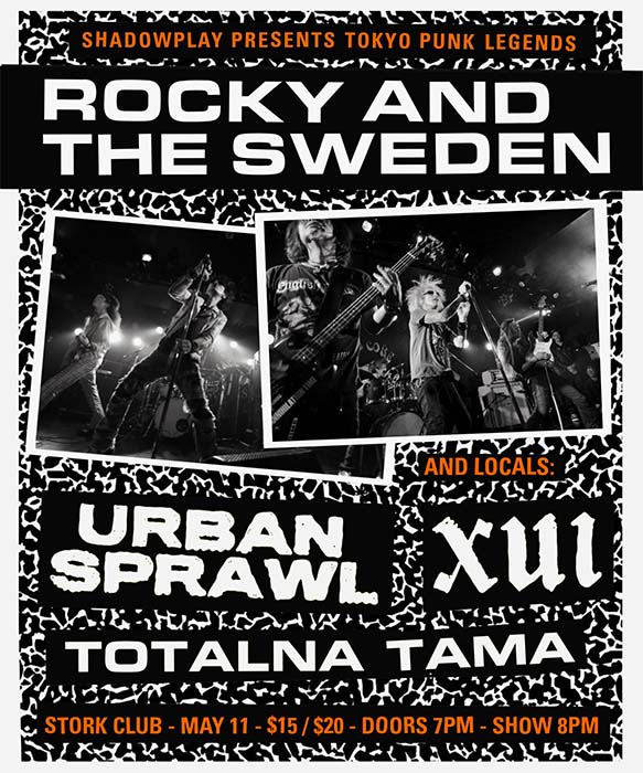 Rocky and The Sweden, Urban Sprawl, XUI, Totalna Tama. Monday May 11, at Thee Stork Club, Oakland. 7pm door, 8pm show. $15adv, $20 at the door.