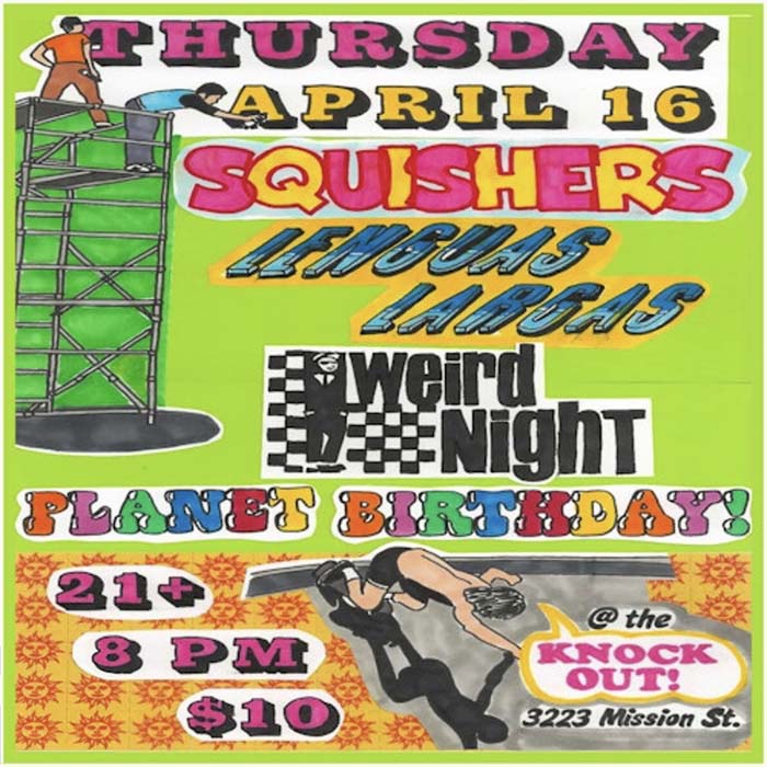 Squishers, Lenguas Largas, Weird Night, Planet Birthday! Thursday April 16, at The Knockout, 3223 Mission St, SF. 8pm, $10, 21+.