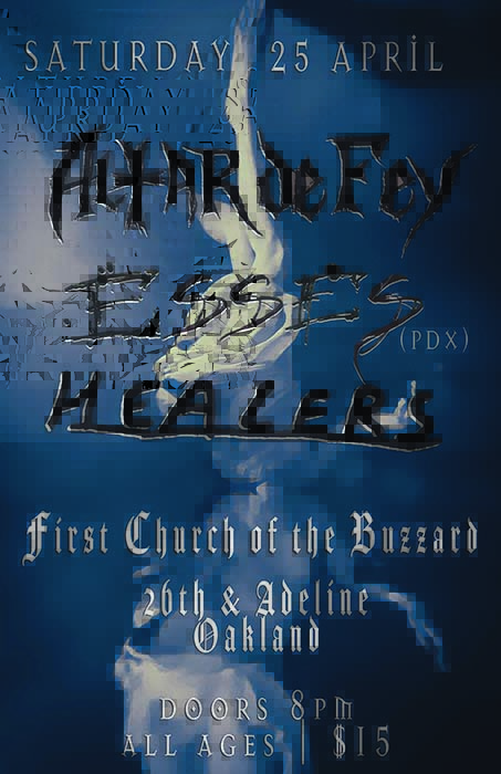 Altar de Fey, Esses (PDX), Healers. Saturday April 25, at First Church of the Buzzard, 26th and Adeline, Oakland. Doors 8, $15.