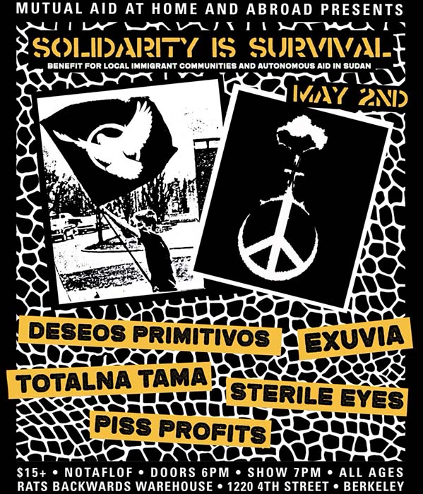 Solidarity is Survival: Benefit for local immigrant communities and autonomous aid in Sudan. Deseos Primitivos, Exuvia, Totalna Tama, Sterile Eyes, Piss Profits. Saturday May 2, at Rats Backwards Warehouse, 1220 4th St, Berkeley. Doors 6, Show 7, $15, notaflof, all ages.